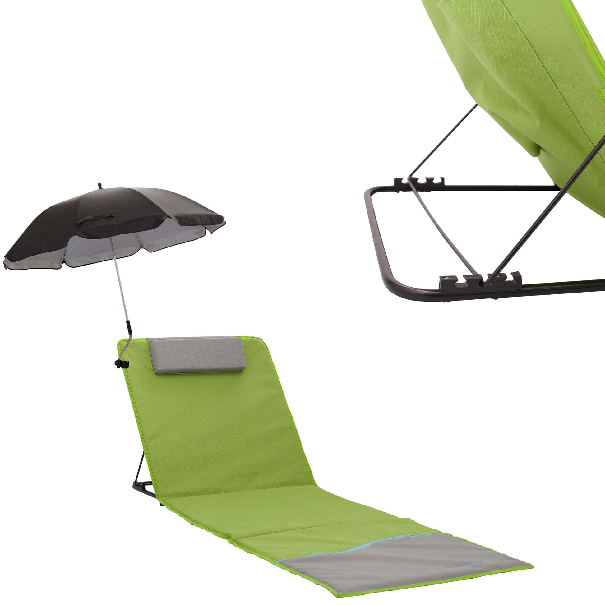 Strandmatte XXL mit Schirm, gepolstert, 200 x 60 cm, mit Rückenlehne, faltbar, grün grau